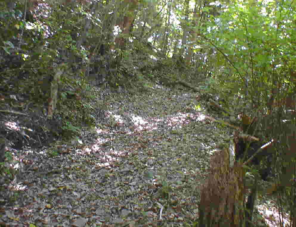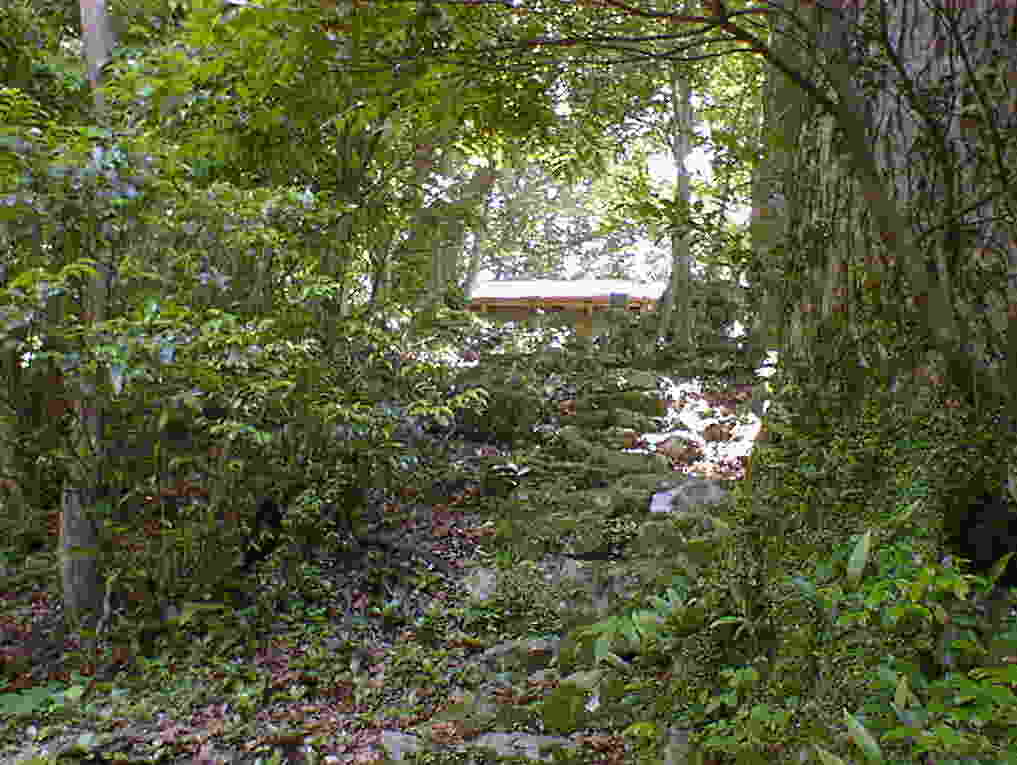 やがて道は山の斜面を離れ、稜線を歩くようになります。それも左右に切り立った、かなり険しい道となります。また、あたりにはごつごつした大きな自然石が随所に見られます。ときには自然石に階段を刻んで歩くようにしたところもあります。元はこの山全体が岩山だったのでしょう。そう言えば、須郷の龍爪さんも大きな岩の上にありました。ここでのポイントは、“巨岩”ですね。岩山が雄々しいイメージを湧かせ、弾避けの御利益を生んだと言ってよさそうです。 いつしか県道を行く車の音も聞こえなくなりました。かなり上まで登ってきましたんですね。木々の梢は黄緑色の葉をつけ、優しく風にそよいでいます。この参道がかつてはたくさんの参拝客でにぎわったとは、いまでは山肌の岩だけが知るのみでしょう。