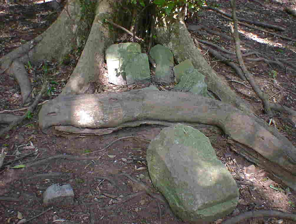 やがて目の前に、周囲の木より大きく育った椎の木が現れます。その木の根本の向こう側を見ますと、、明らかに人の手による物と分かる石造物があります。形からして石祠のような神様かと思われます。石祠の扉によく見られるデザインのパーツがあるからです。でも、屋根に当たるそれは見あたりません。散逸してしまったのでしょうか。でも、いかにもここに神様を祀りたい、と思わせるような場所と椎の木です。山神様かな…。でもこれで、ここが人の通ったところと確信できる材料が得られました。